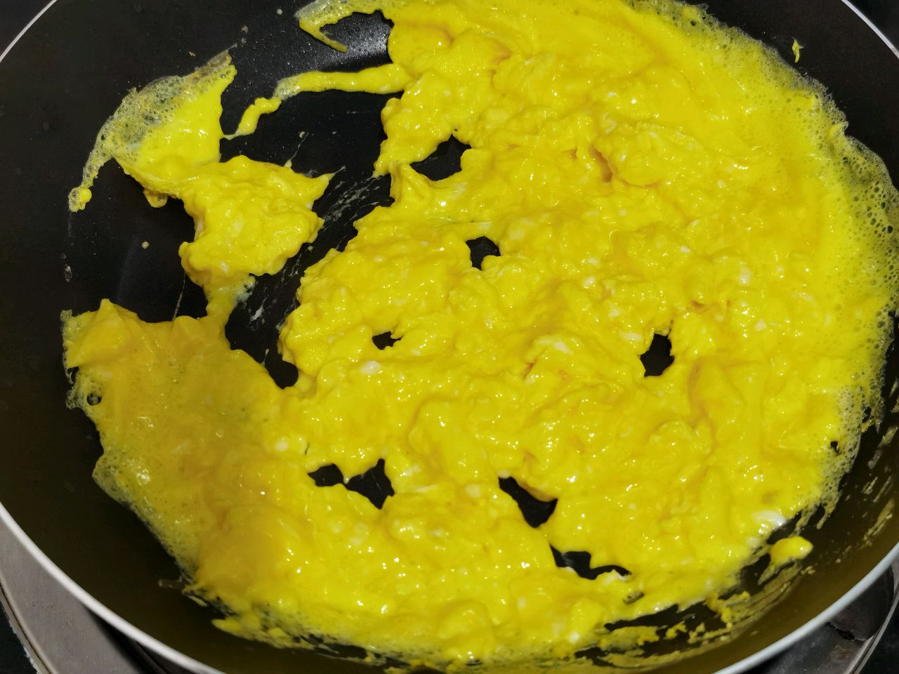步骤2、鸡蛋加椰汁打散,倒入锅中,底部凝固之后快速搅散,反复操作,直到如图分离。
