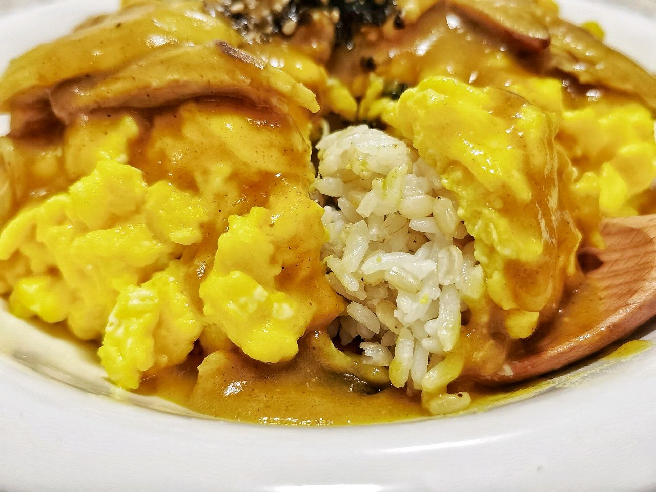 步骤7、淋在滑蛋上,再撒上一点海苔碎,美味的滑蛋咖喱鸡饭做好了~