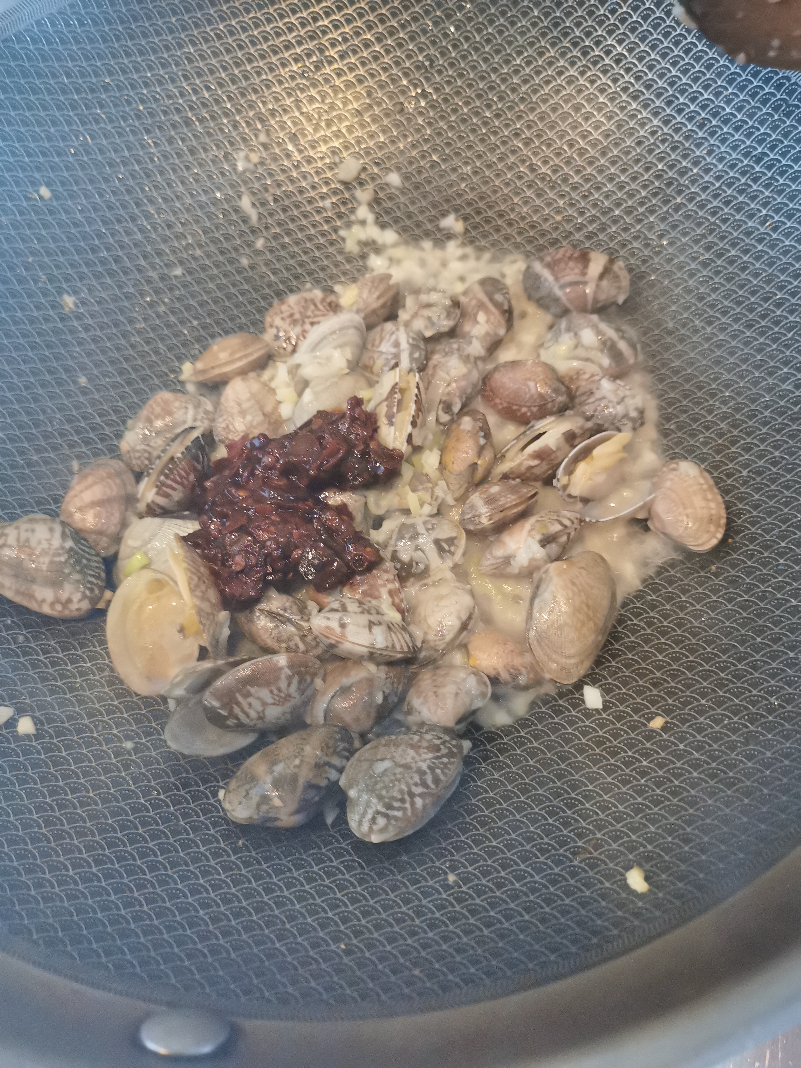 步骤5、蛤蜊基本开口后,加豆瓣酱,炒出红油。