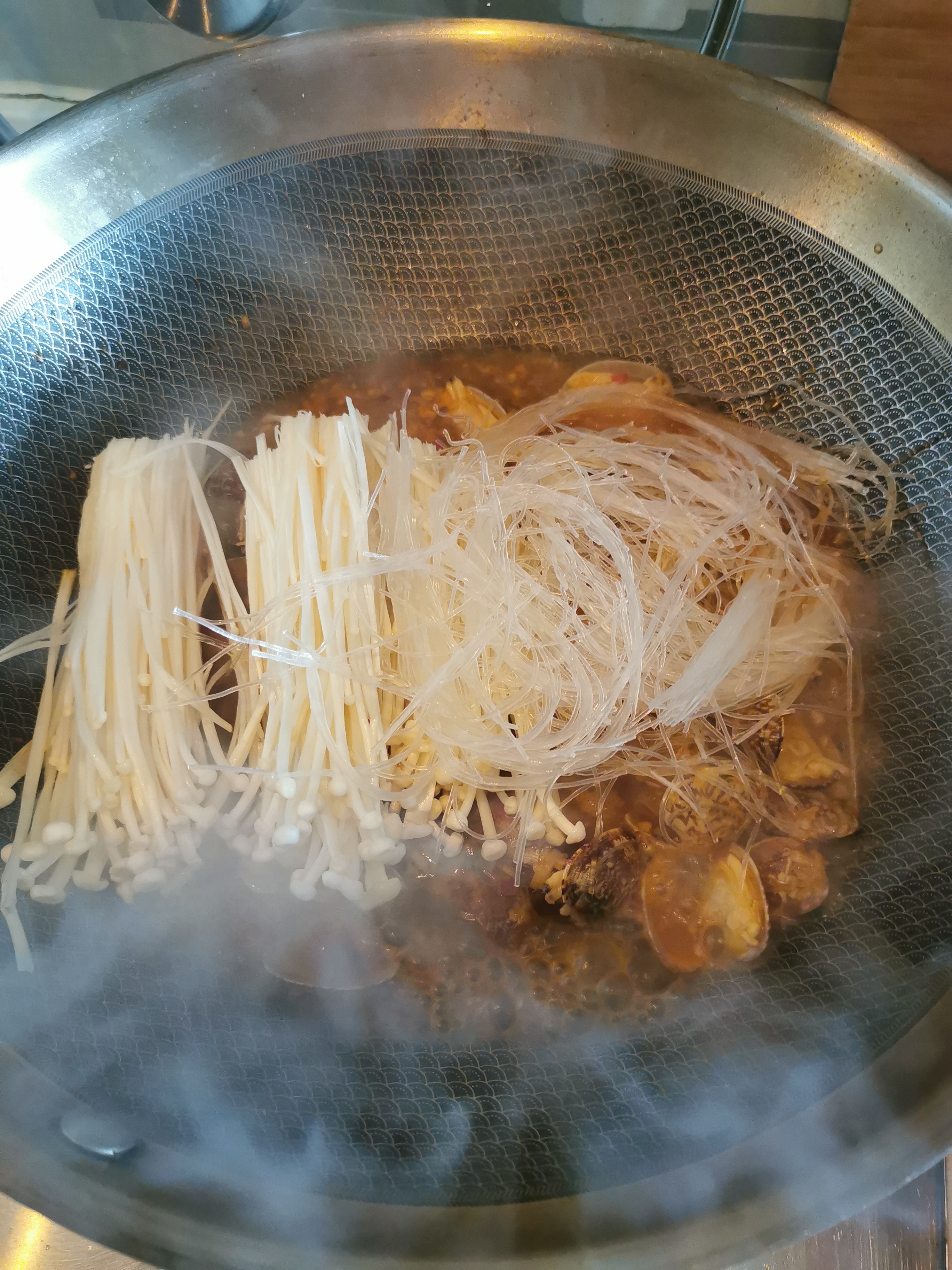 步骤6、加生抽、蚝油,糖,加水没过蛤蜊大部分,大火煮开。