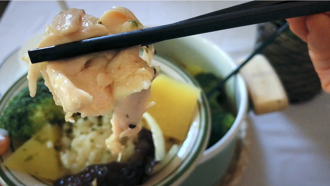 步骤5、打开锅盖,浓浓的鸡汤味道扑鼻而来啦~夹起一块鸡肉尝尝,非常鲜嫩可口