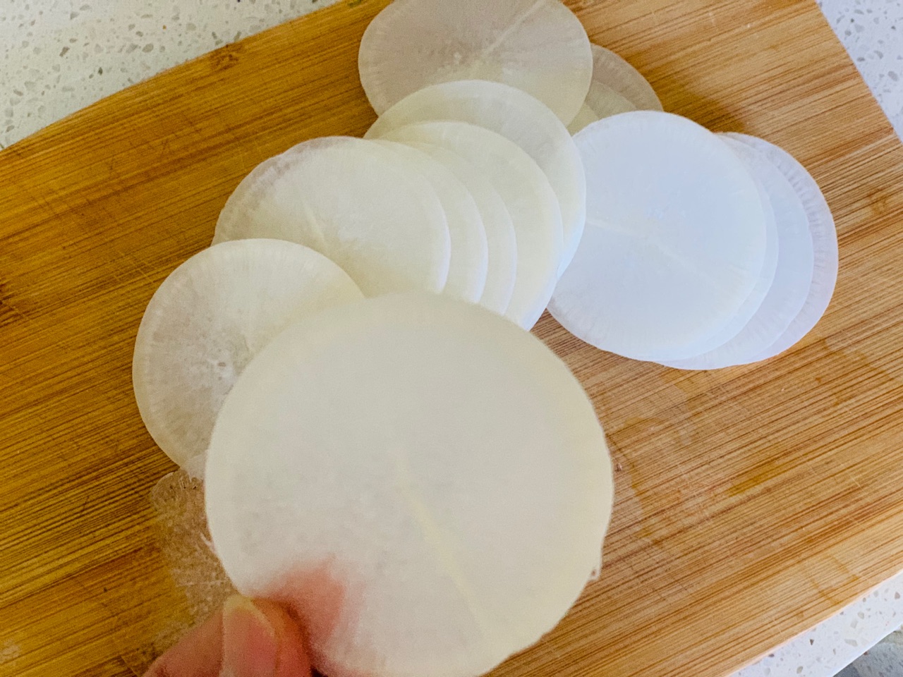 步骤1、白萝卜切均匀的薄片,清水加一点儿盐烧开,水开焯萝卜,半透明捞出。