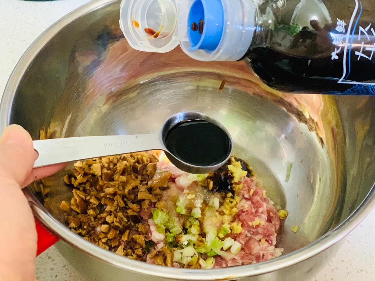 步骤3、猪肉饺馅,香菇剁碎,姜、香葱切末,香葱留部分绿叶部分出锅装饰用,加入调料和一个蛋清调馅。