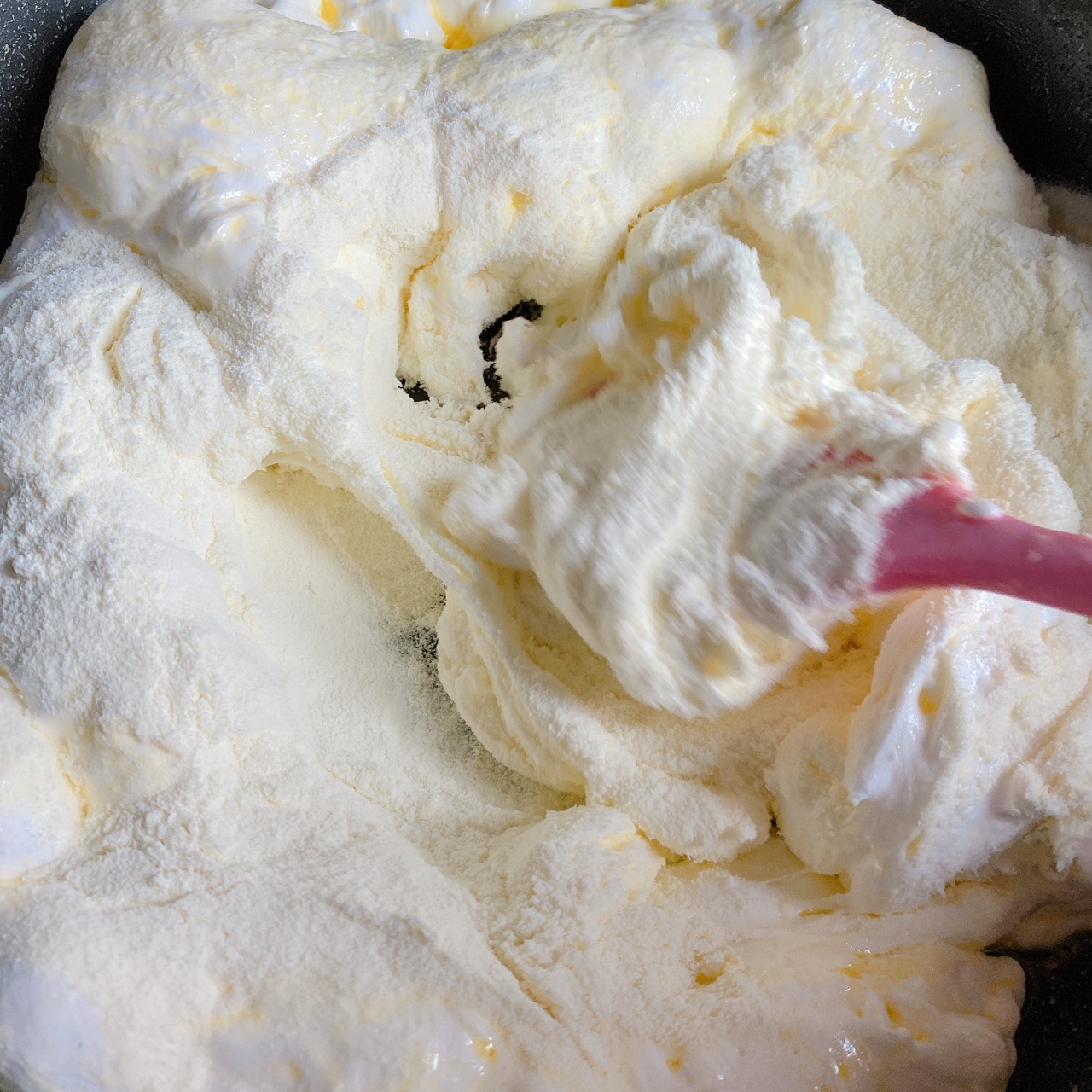步骤5、翻拌到棉花糖融化成一体的时候加入奶粉搅拌奶粉搅拌的差不多就关火