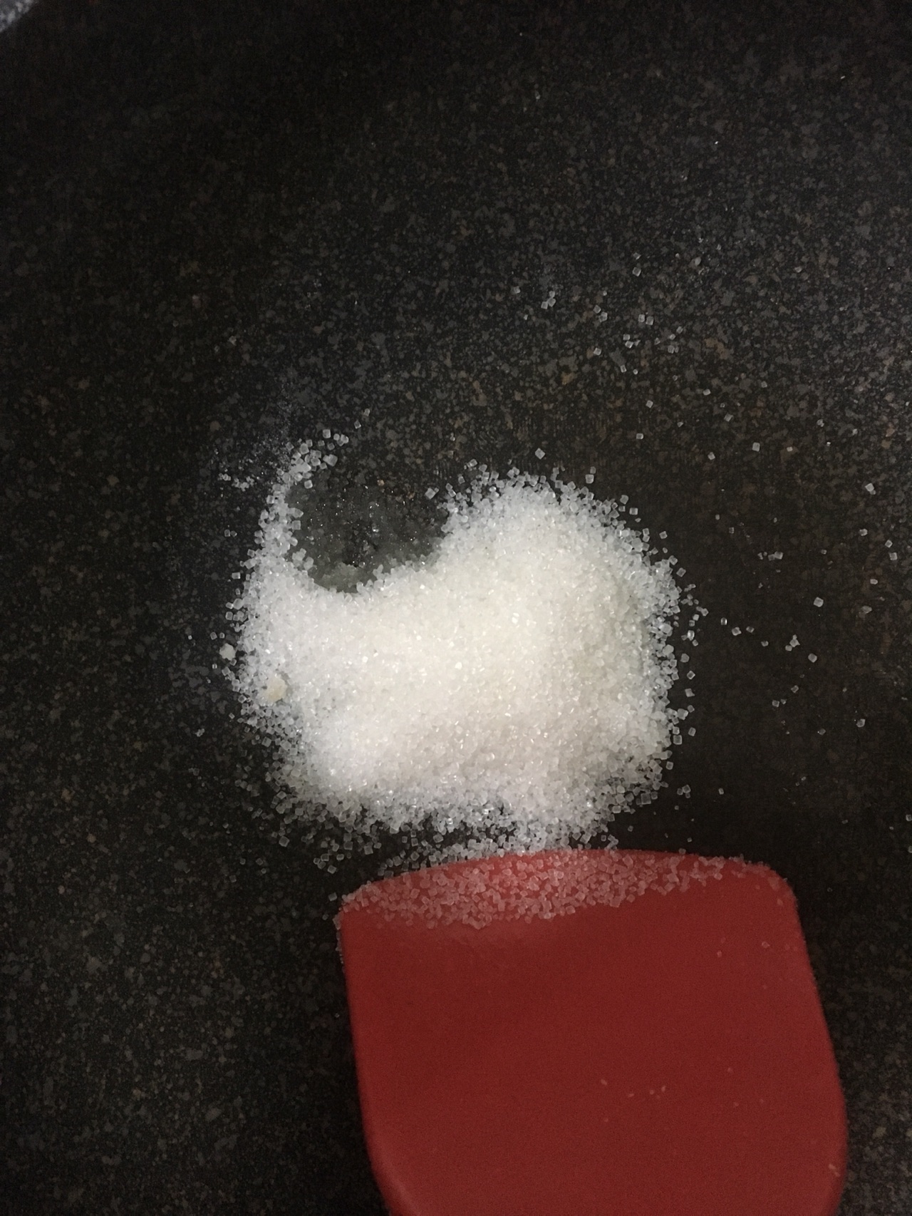 步骤3、中火将白糖熬化成褐色糖浆后,加入打好的花生碎。