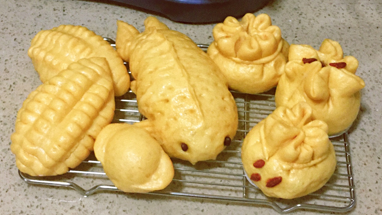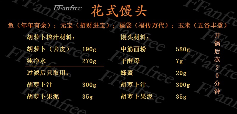 步骤2、tips:Ⅰ胡萝卜榨汁的材料是去皮去跟后的净重量,切小块,榨汁会更细腻,然后用细滤网过筛两遍滤除果汁,做馒头只取用300g果汁和35g果泥。剩下的做包子馅或者饺子馅;Ⅱ馒头含水量低,要想发的好,要先把酵母和液体(胡萝卜汁)混合成酵母液再和面粉混合,添加蜂蜜也会促进发酵;发酵完成的面团需要加手粉揉匀,充分排气后,再切割小剂子整形。鱼(约188g面团);福袋(约88g面团,包30g豆沙馅);玉米(约66g面团);元宝(约35g面团);Ⅴ关火后不要立即开盖,焖5分钟后再开,否则容易回缩