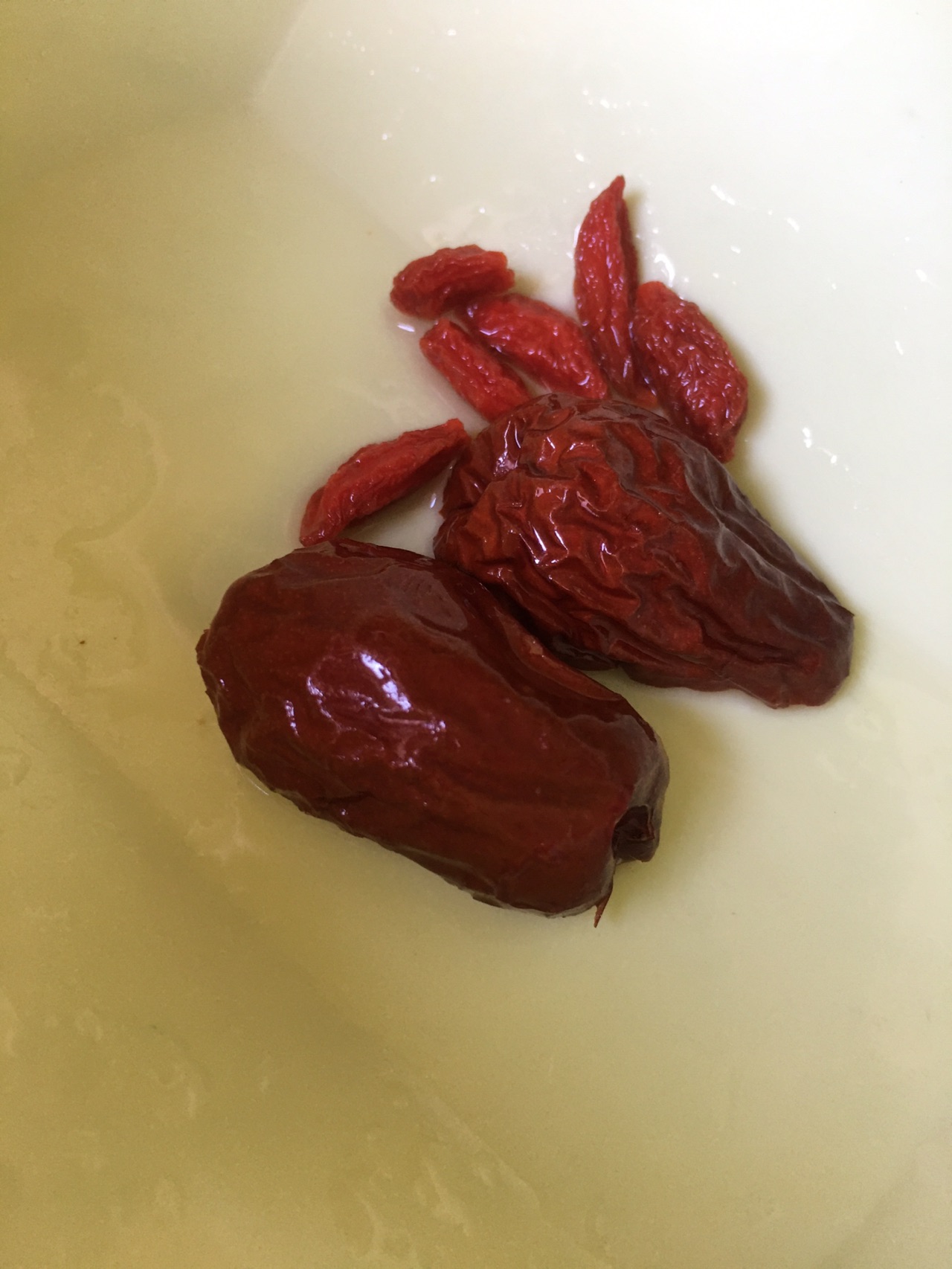 步骤1、清洗干净红枣枸杞(红枣对半切开,去核)