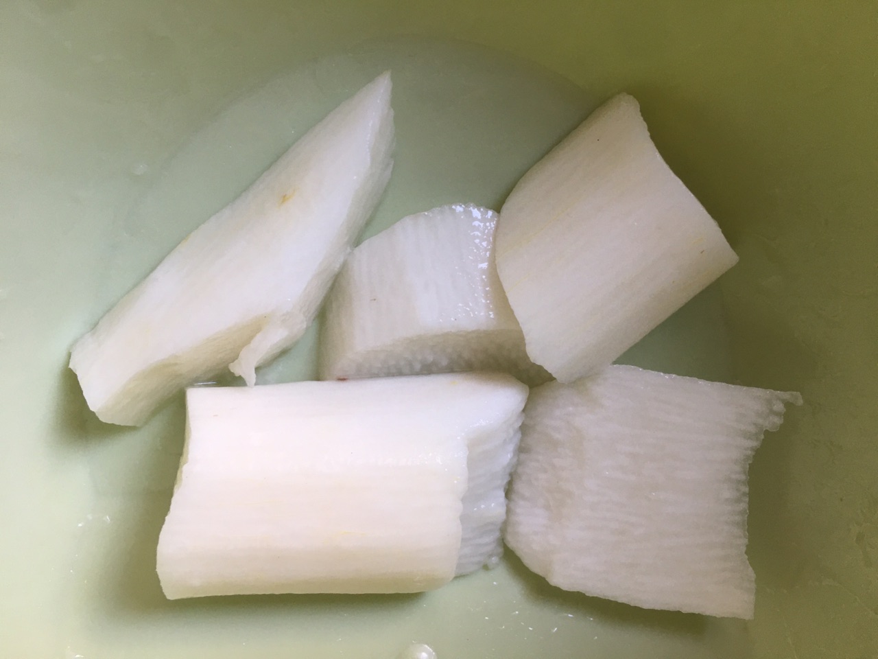 步骤2、淮山清洗干净,去皮,切块(刀功渣渣)