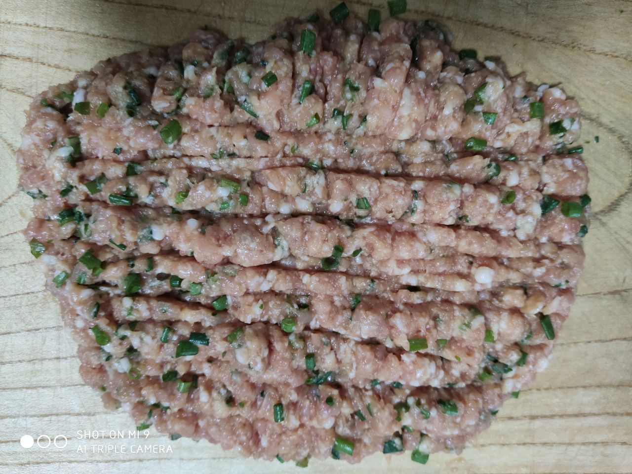 步骤1、猪肉切碎,剁碎后加酱油,盐,料酒,白糖剁均匀后,加入葱花和鸡蛋搅拌均匀