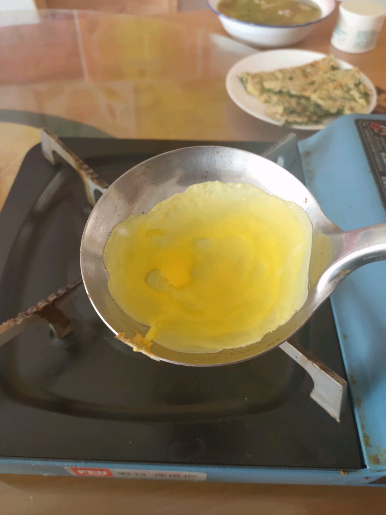 步骤3、勺子放火上加热,割一块肥肉,用筷子在勺子内壁擦拭几圈,涂上油脂。然后舀一小勺蛋液,边摇边靠近火苗,使蛋液凝固。