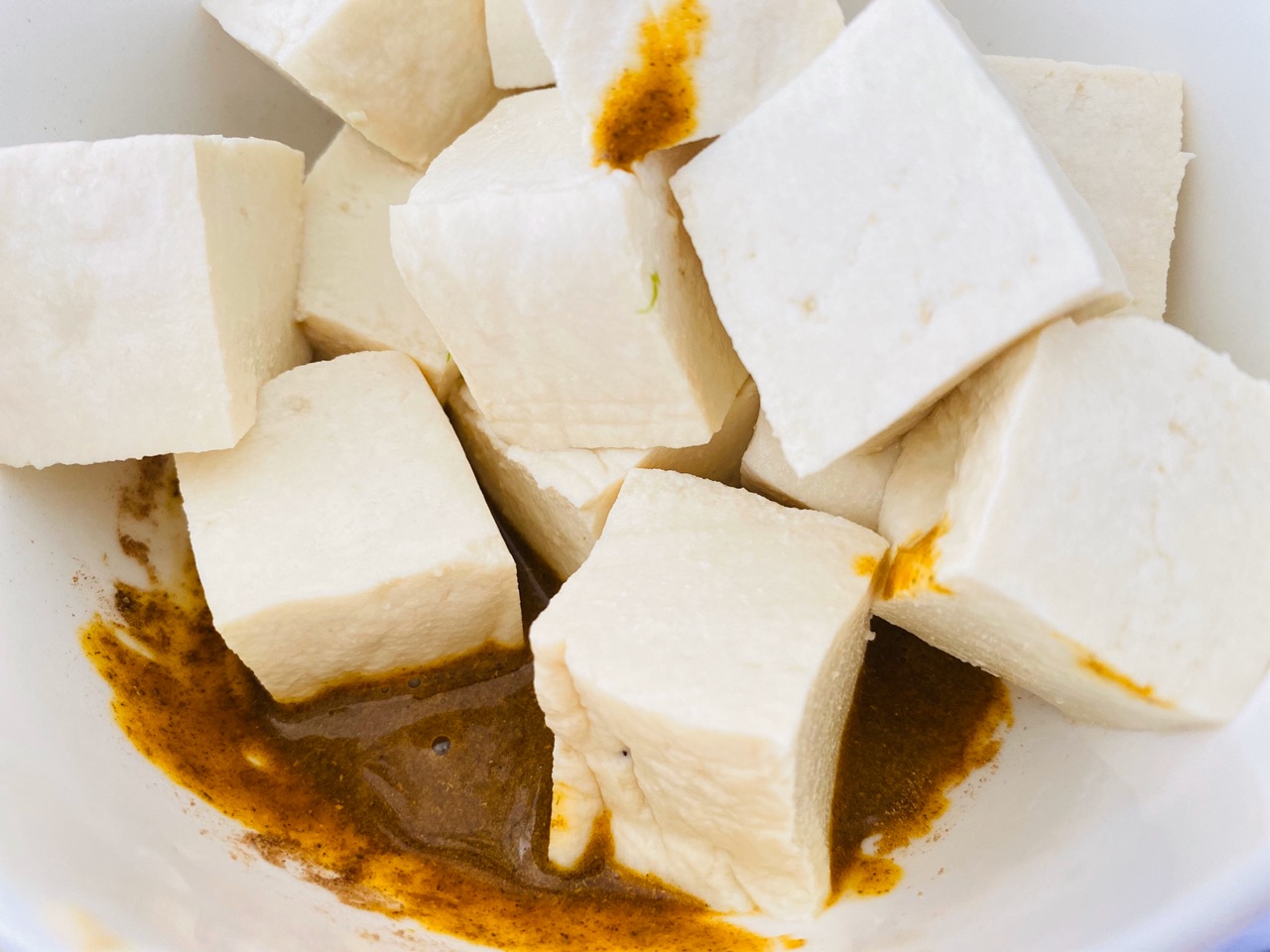 步骤5、孜然、小茴香、花椒、芝麻用小火炒香,然后加点盐舂成粉状,再加入一个鸡蛋搅拌均匀,豆腐切块每一块豆腐都要均匀蘸上蛋液;