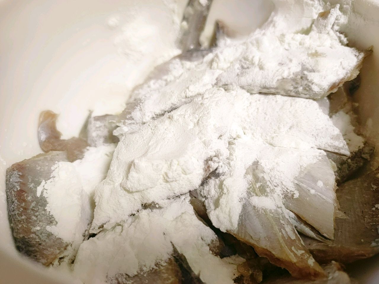 步骤2、撒干面粉,泡打粉,颠盆,让粉均匀粘在鱼块上。
