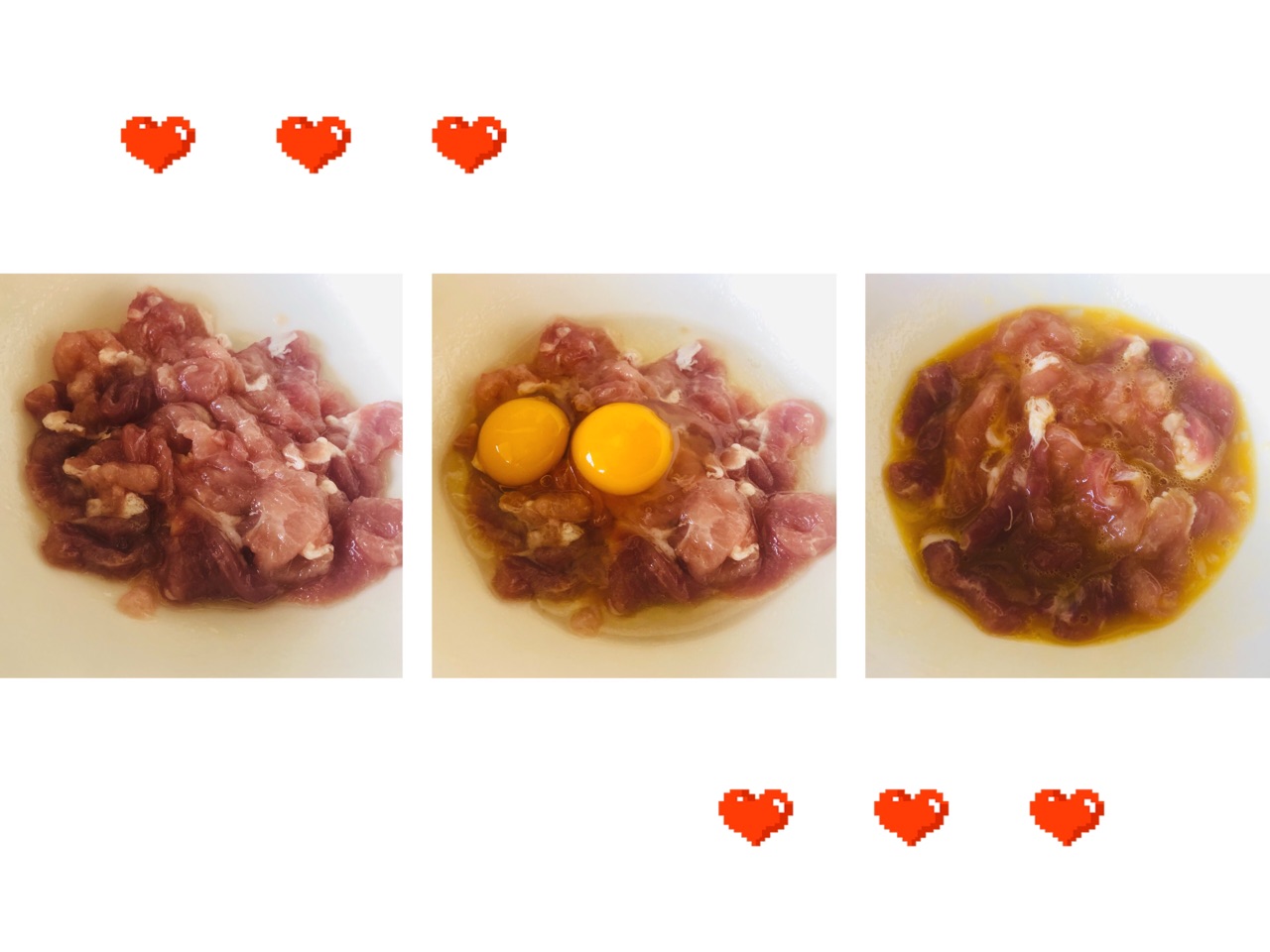 步骤2、腌制好的肉丝打入两个鹌鹑蛋、加入软化的黄油