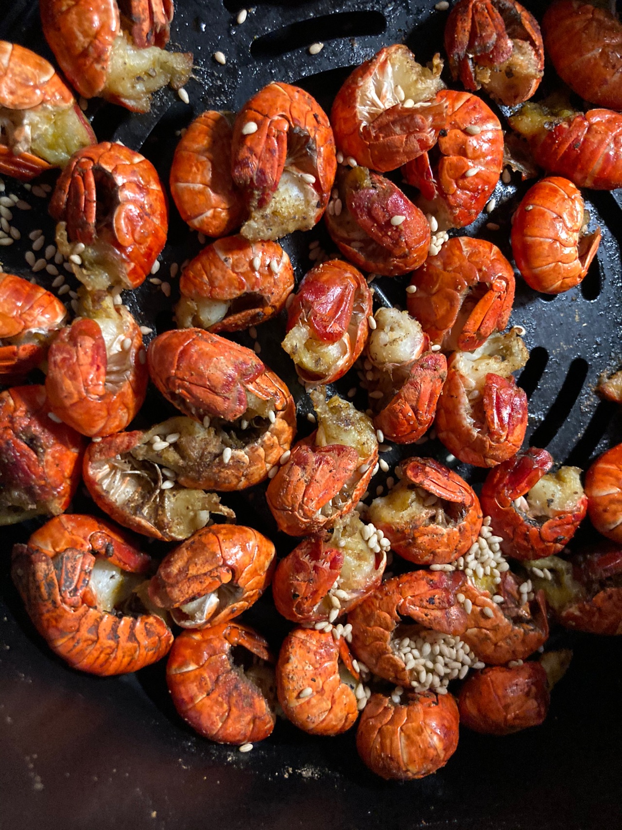 步骤1、洗净小龙虾尾,放进空气炸锅,涂黄油,撒上十三香。180度,烤11分钟。