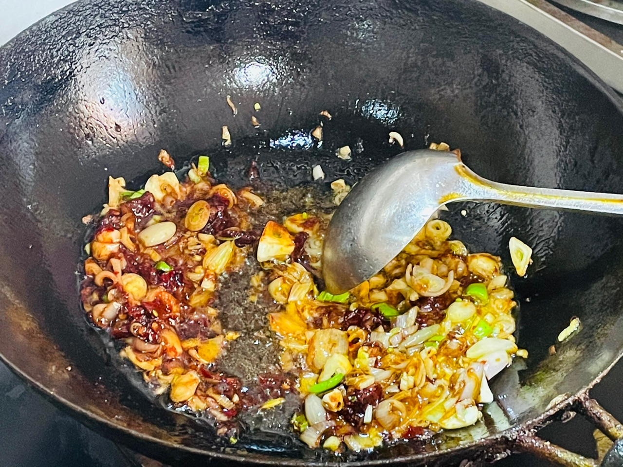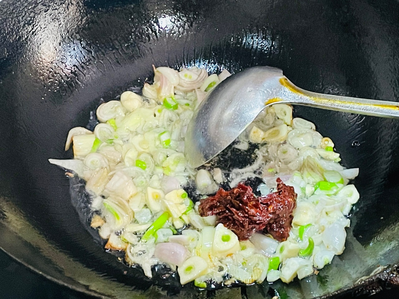 步骤3、起锅烧油放入洋葱大葱和蒜