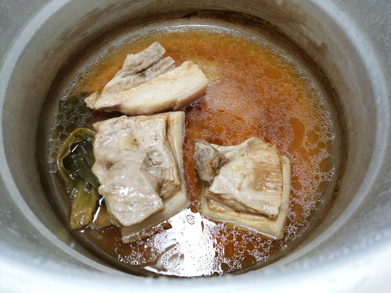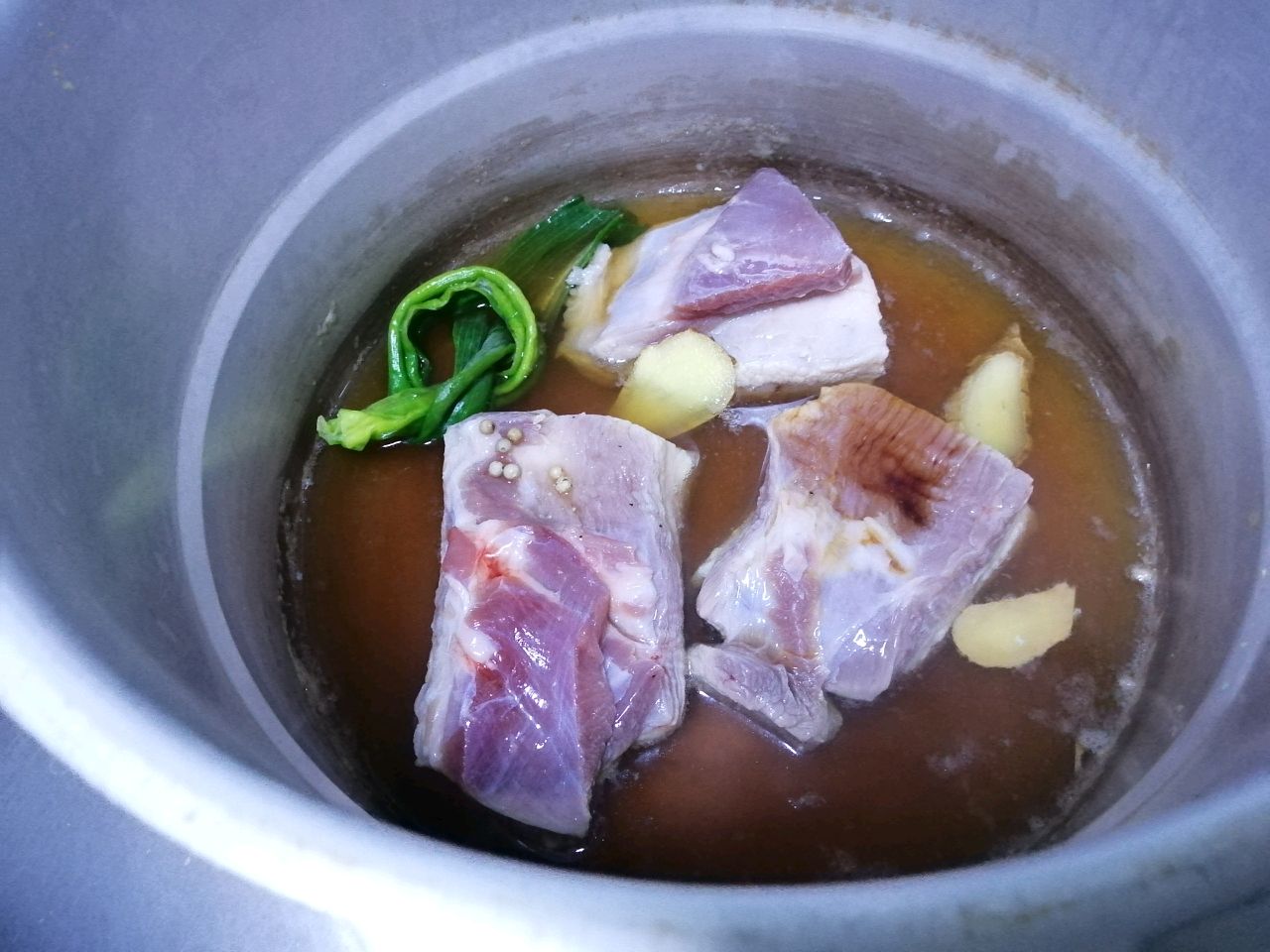 步骤2、放入高压锅,加入红烧酱油,料酒,胡椒粒,葱段,姜片,加入水没过肉的1/3,高压锅上气后煮10分钟
