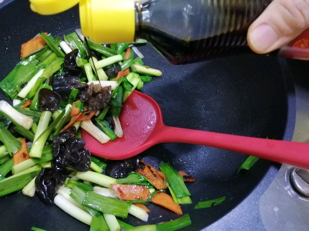 步骤7、放入蒜苗,木耳,酱油翻炒