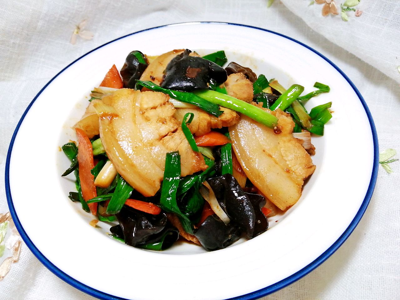 辅料:胡椒粒5g、葱1段、姜3片、红烧酱油10g、炒菜:炖好的五花肉150g、郫县豆瓣酱10g、蒜苗6颗、红烧酱油10g、木耳8朵、盐1g、葱花20g