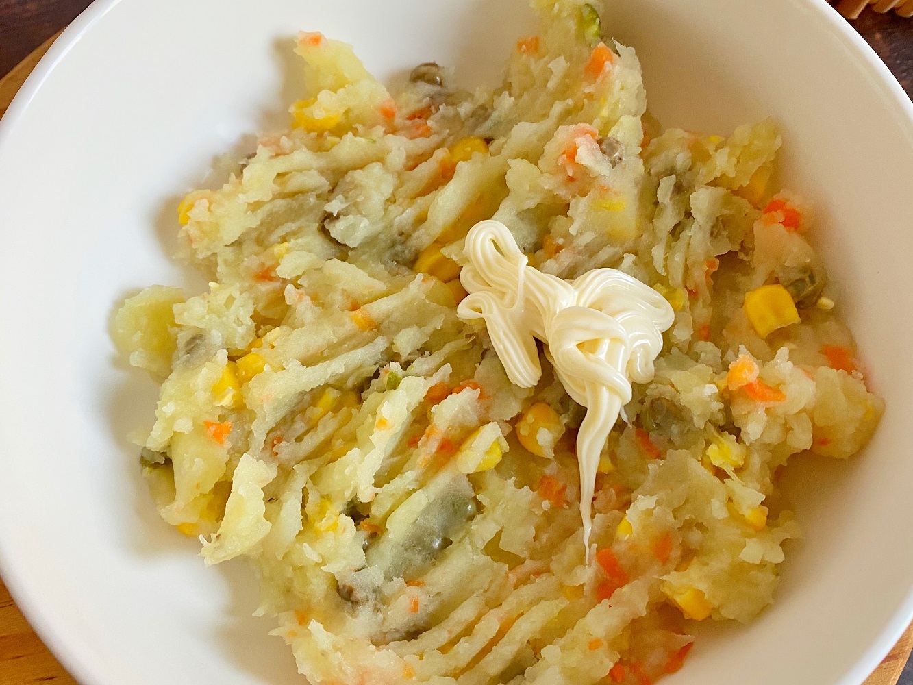 步骤2、蒸熟后放入玉米粒、豌豆粒和胡萝卜丁压成泥;