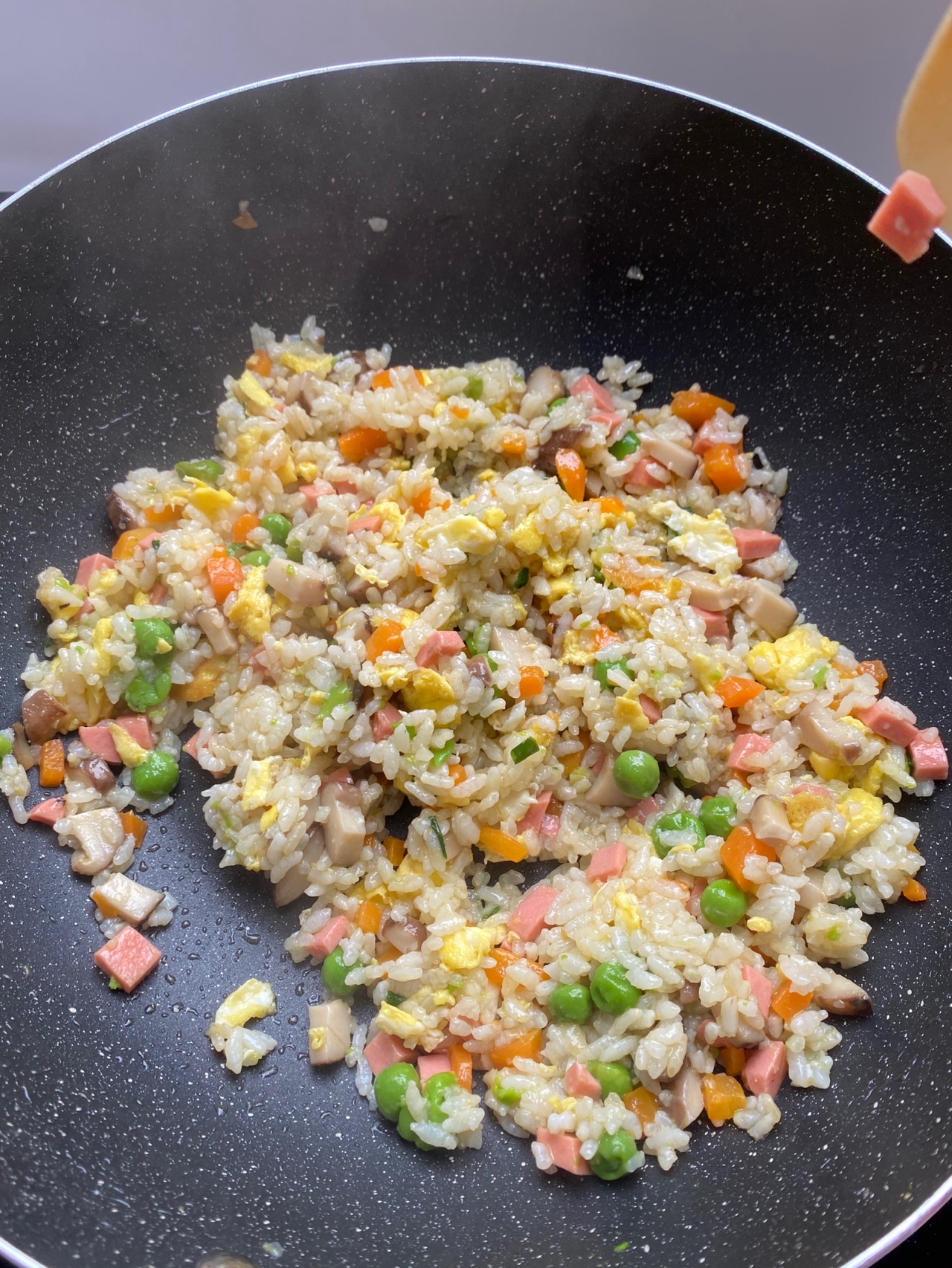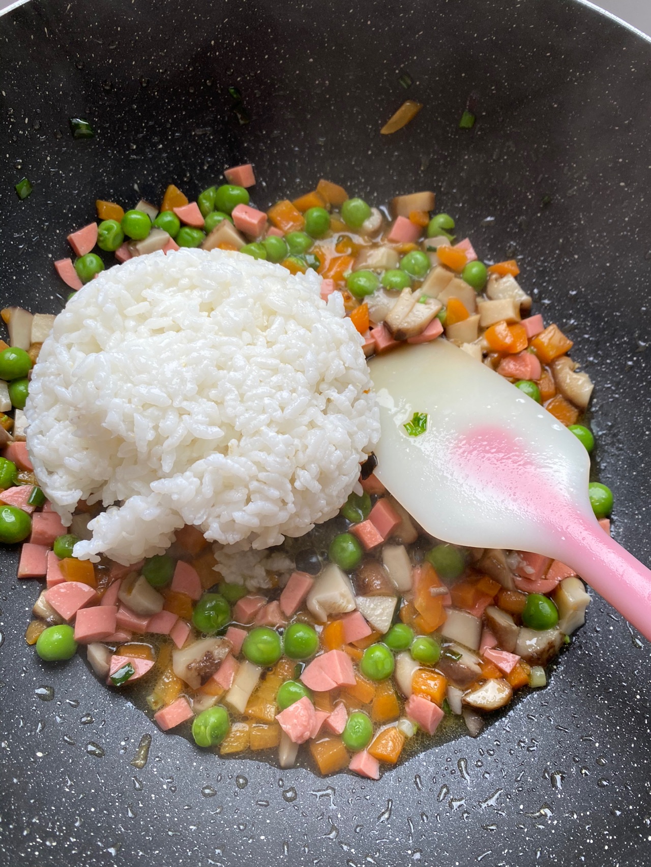 步骤8、加入火腿丁翻炒片刻