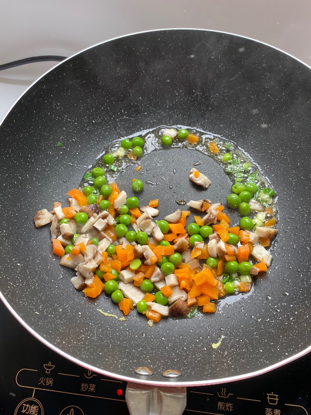 步骤7、放入蔬菜粒翻炒