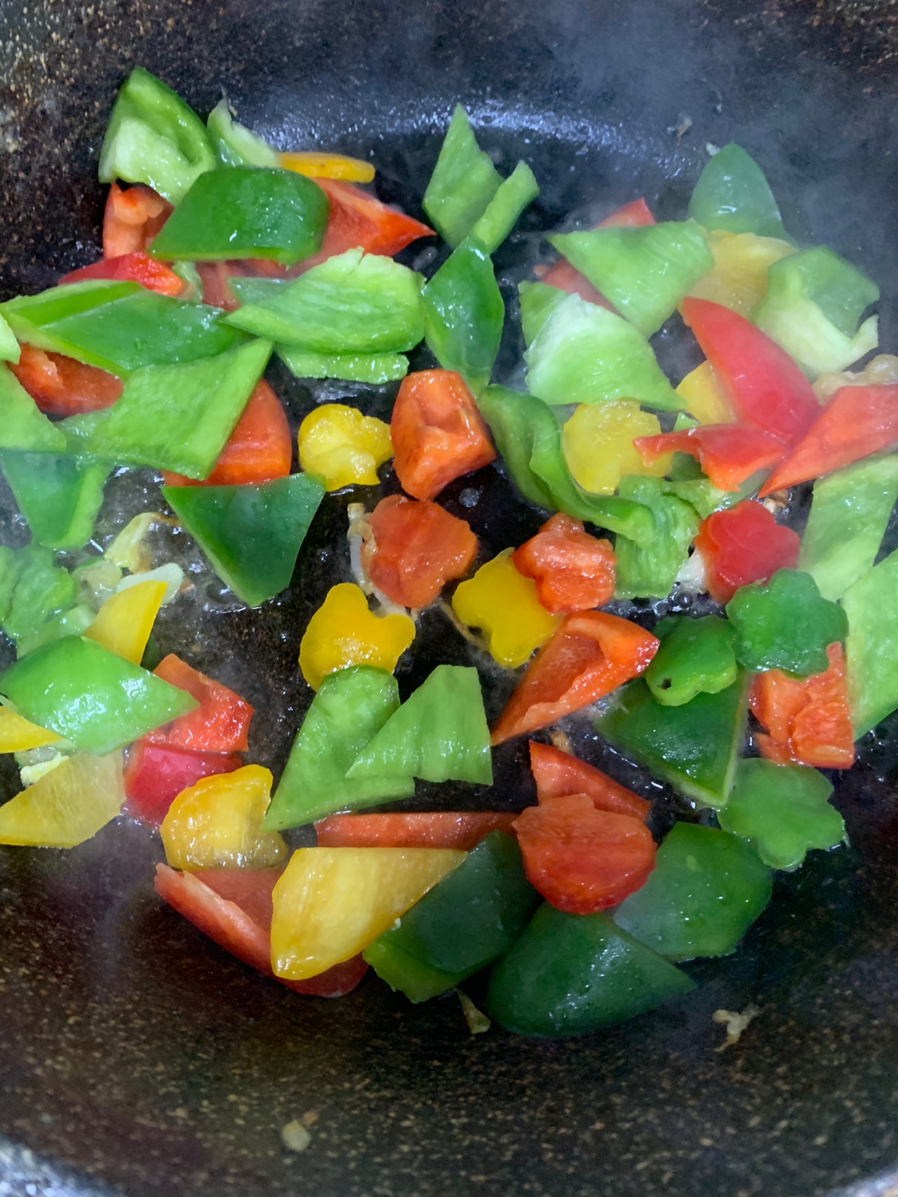 这道鸡蛋炒三椒,选用金龙鱼外婆香小榨菜籽油炒制,它选用优制的油菜籽,传承小榨工艺精髓制作完成,香味浓郁,青椒彩椒富含维生素C在配上鸡蛋炒制营养丰富,漂亮美味,为年夜饭的增加一道清新的色彩