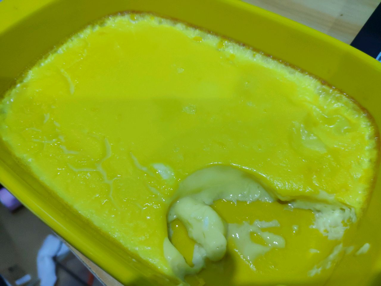 步骤1、鸡蛋牛奶搅拌均匀,倒入烤盘,放入烤箱,10分钟。210°