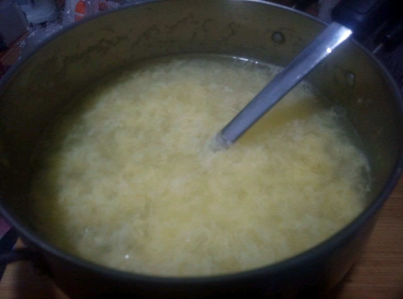 步骤1、适量水烧开,淀粉加少许凉水化开,分次加入沸水中,微微浠糊状,烧一会后,均匀搅入鸡蛋液,关火,搞定一个汤