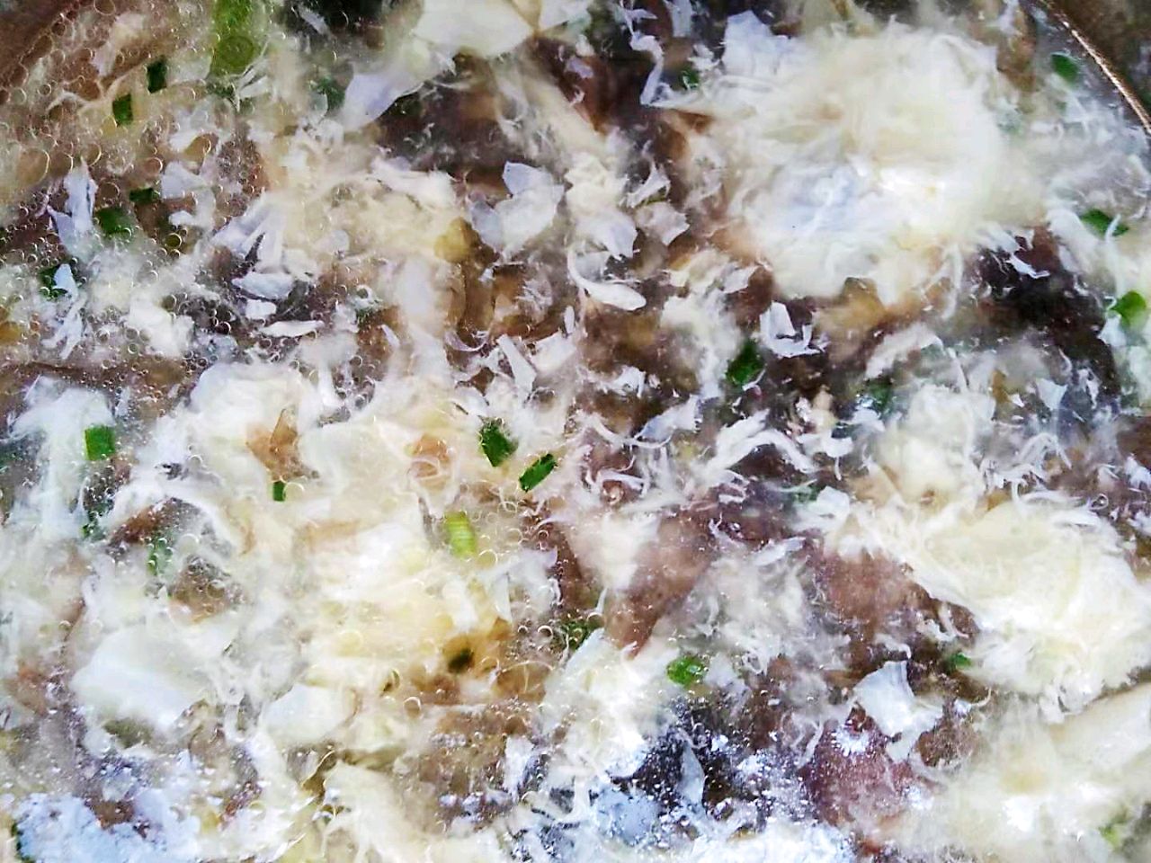 步骤9、汤水烧至冒泡时,将搅散的蛋液抬起慢慢倒入小锅中,用筷子快速搅几圈,让蛋花迅速在锅中飘起,防止其在锅底结块。