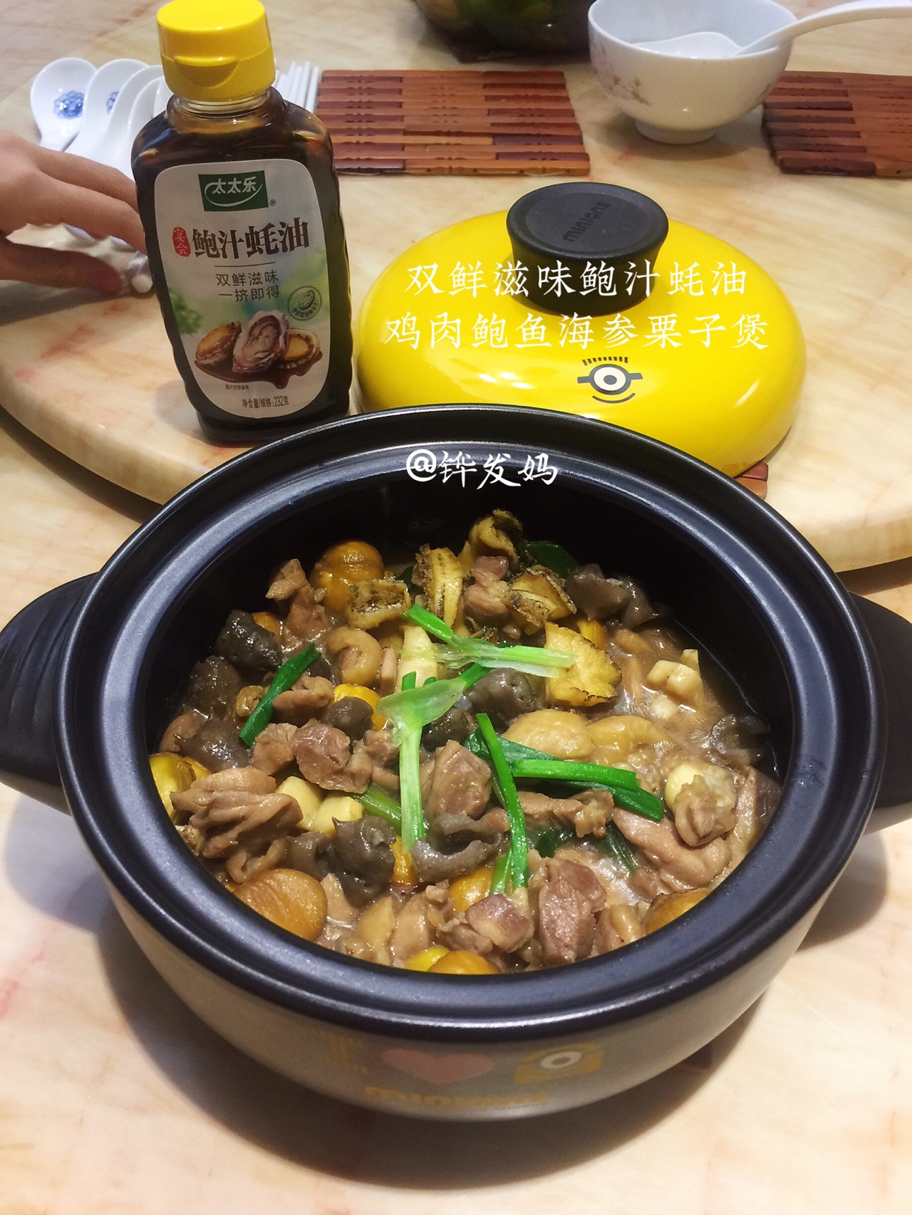 双鲜滋味鲍汁蚝油, 鸡肉鲍鱼海参栗子煲,板栗的甘甜,鸡肉鲍鱼海参的鲜,再加上太太乐鲍汁蚝油双鲜滋味,更加入味,一口清甜爽口的板栗一口肉香四溢的鸡肉,绝对是下饭利器。