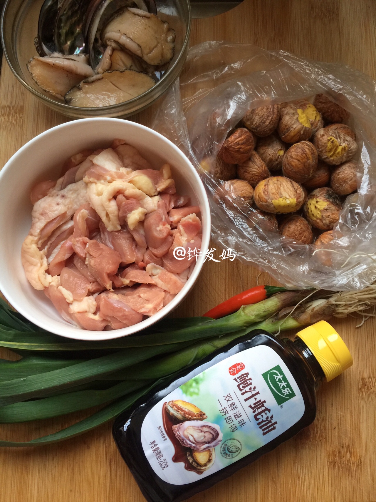 辅料:鲍鱼、泡发好的海参4个、4条(随自己喜好加入)、香菇3朵、姜片、葱、蒜2片、适量、辣椒1个、腌制下鸡腿肉、太太乐鲍汁蚝油1勺、太太乐原味鲜酱油半勺、盐、胡椒粉、白糖少许、生粉半勺、清水适量
