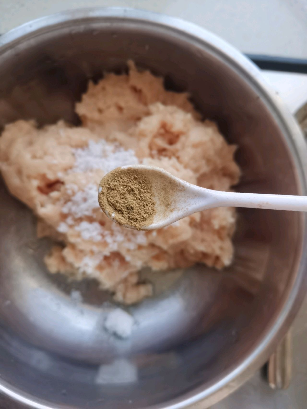 步骤8、加入5克盐(我做的有一点淡,因为有宝宝吃,盐还可以适量多一点点)
