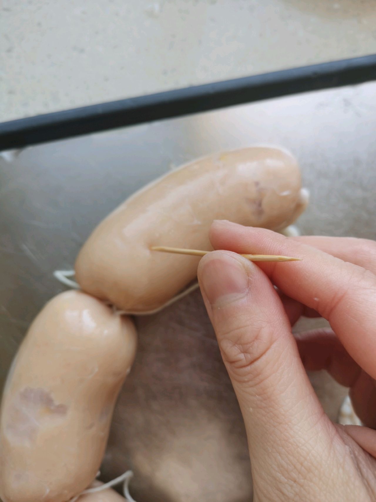 步骤19、灌的时候轻一点,不要装的太满,灌好后在肠衣末端打个结