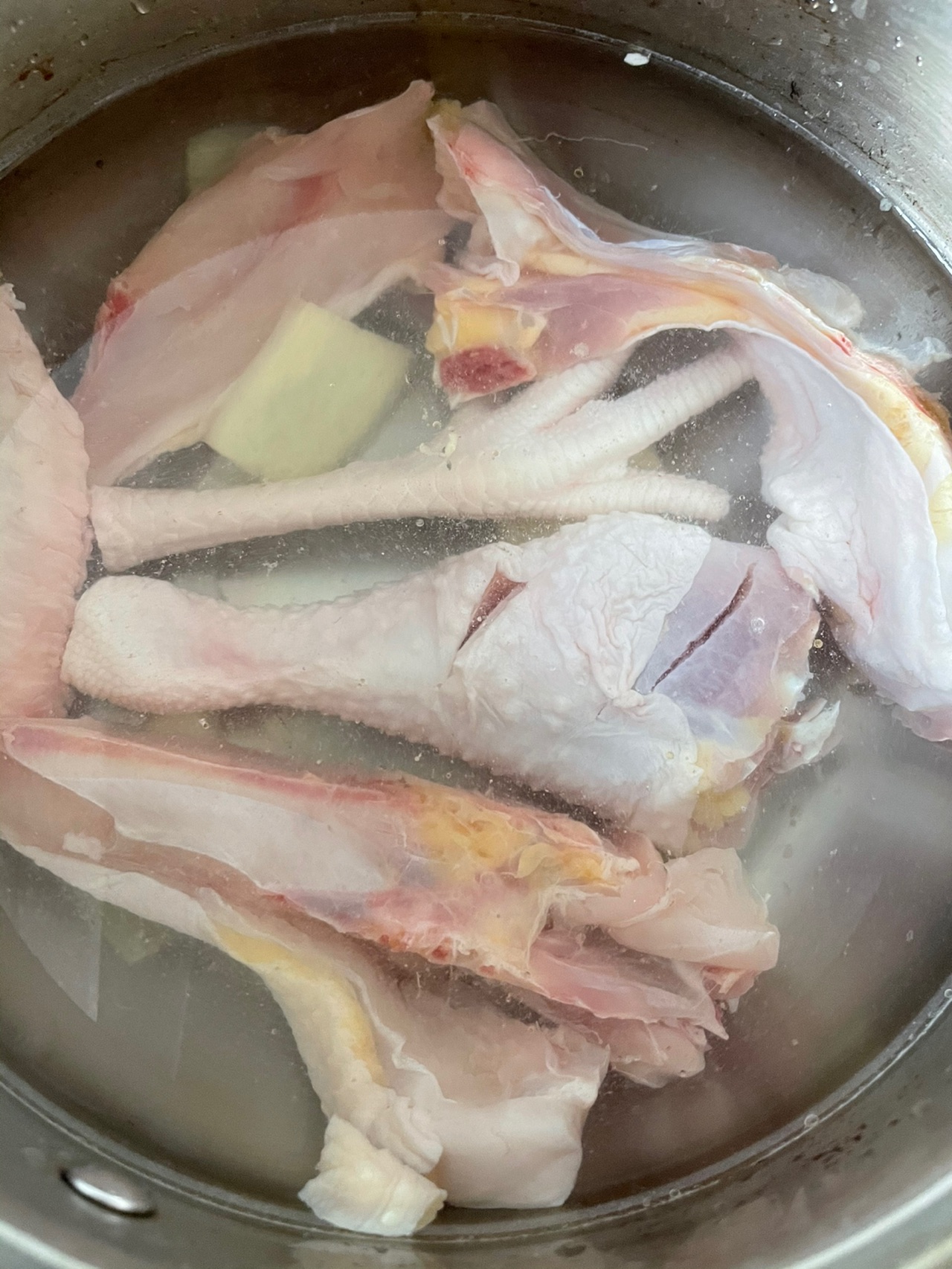 步骤1、鸡肉冷水下锅,加姜片料酒煮沸后捞出备用