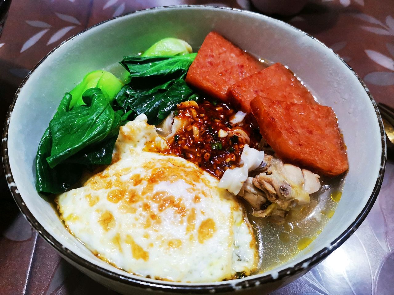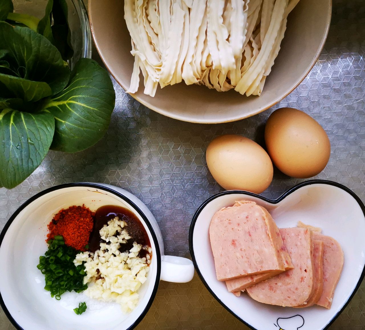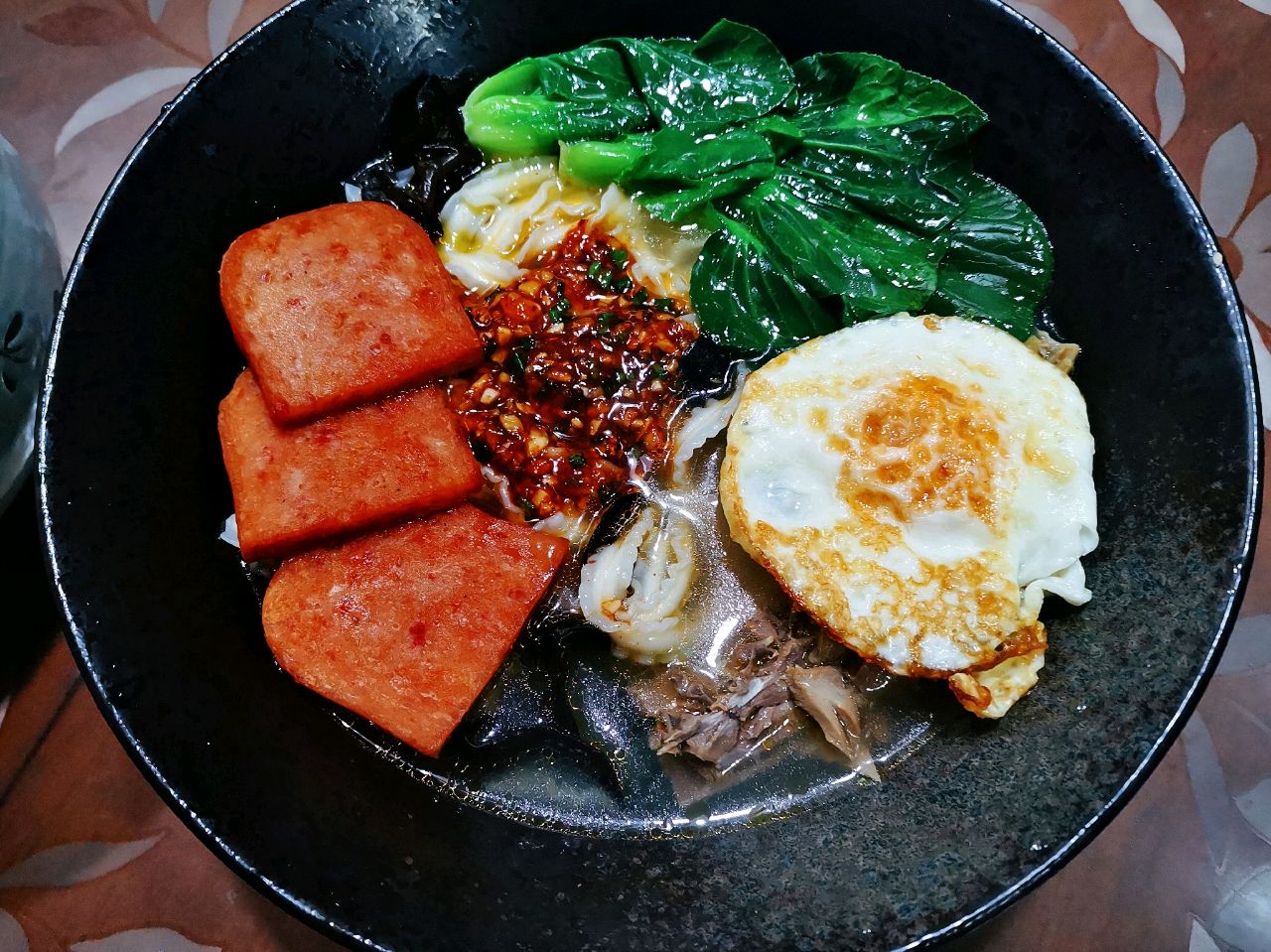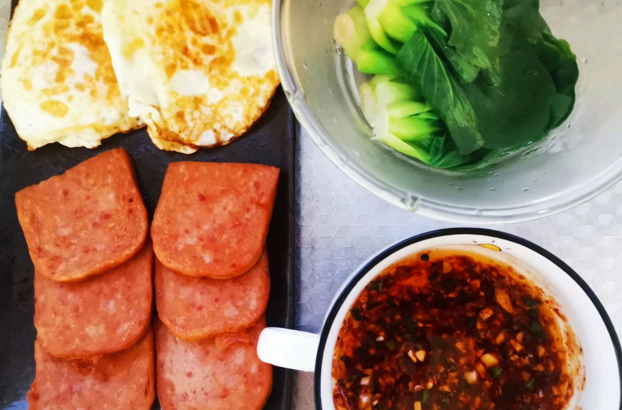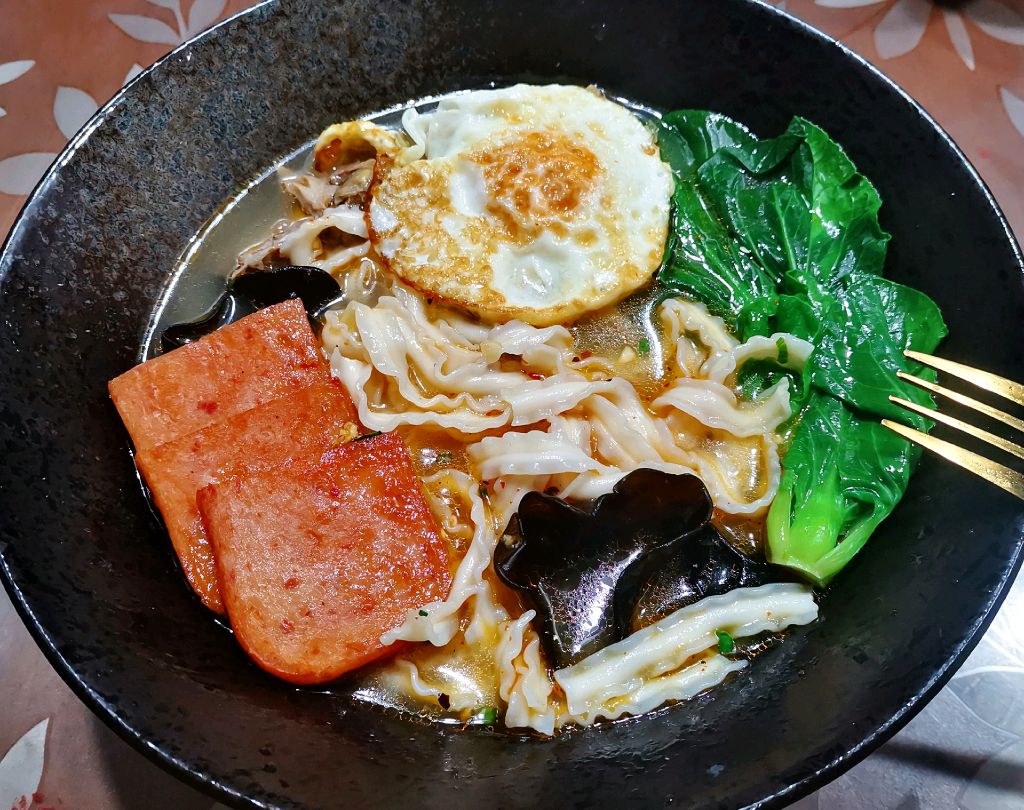 步骤2、就鸡汤面有点吃不饱,自己可以加点自己喜欢的材料,丸子啥的,我用的鸡蛋和午餐肉。