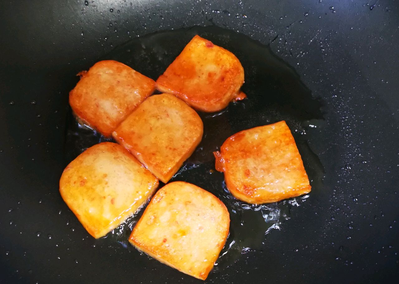 步骤4、油锅继续利用,把午餐肉放进去煎。煎到表皮金黄。