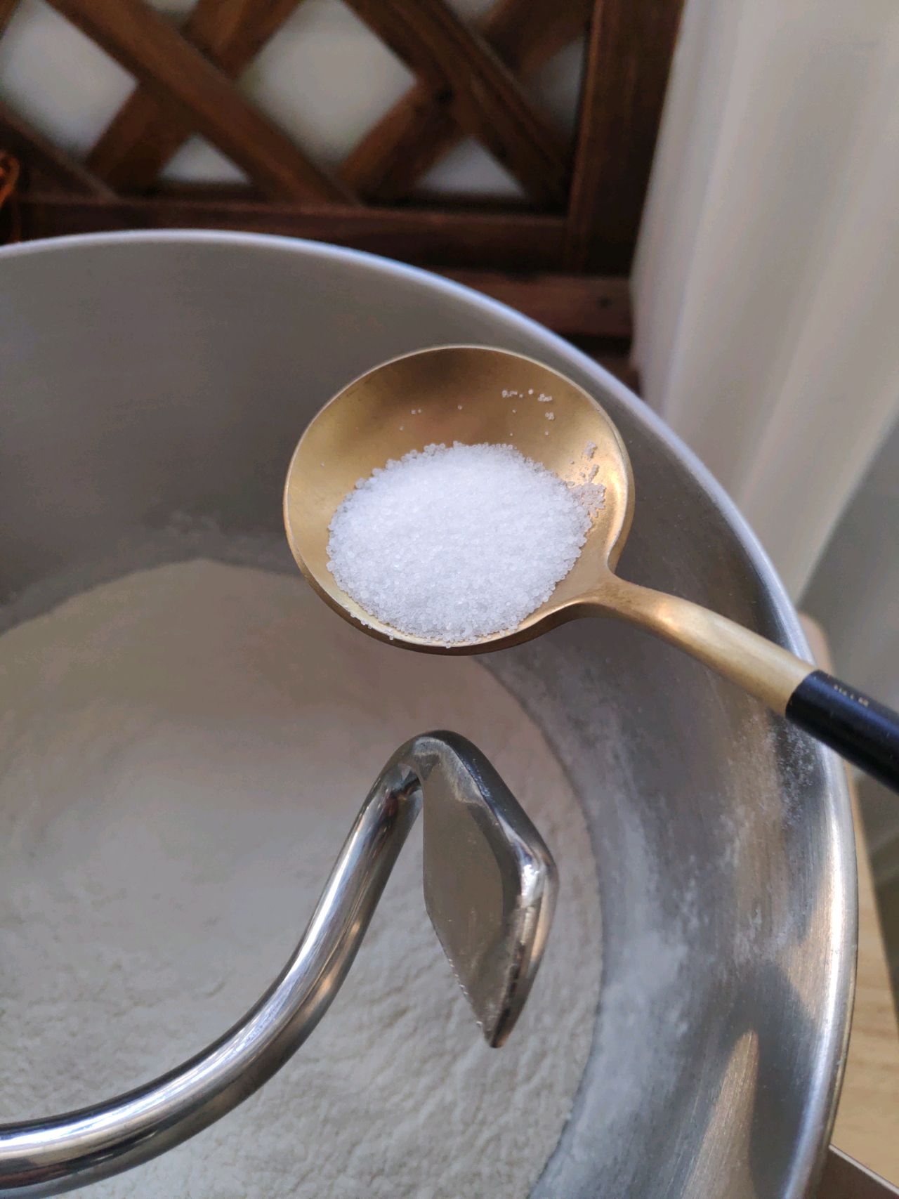 步骤1、厨师机的搅拌锅里放入面粉再加入食盐