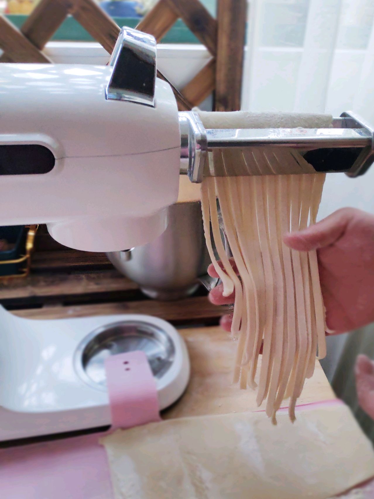 步骤5、盖上保鲜膜松弛20分钟,然后分成2等份,搓成条条稍微按扁一下。将厨师机换上压面的配件,压成片状
