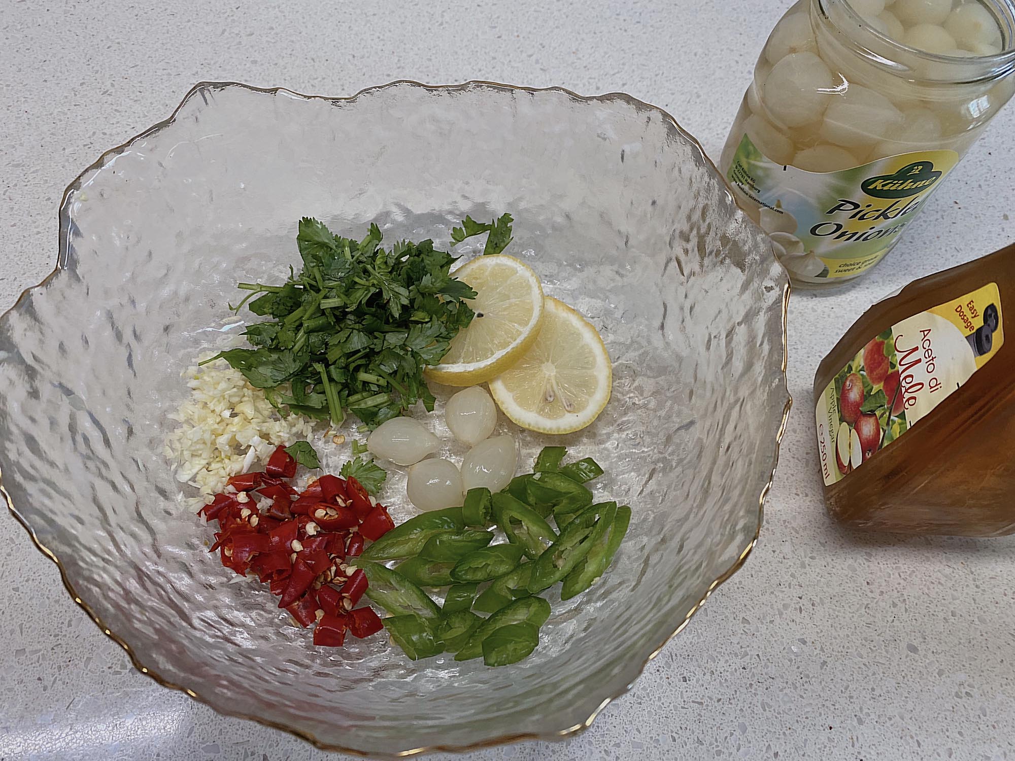 辅料:凉开水250ml、白糖25克、精盐5克、生抽50ml、香菜2根、小米椒6个、嫩姜三片、冠利鸡尾洋葱6粒、柠檬1个、料酒少许
