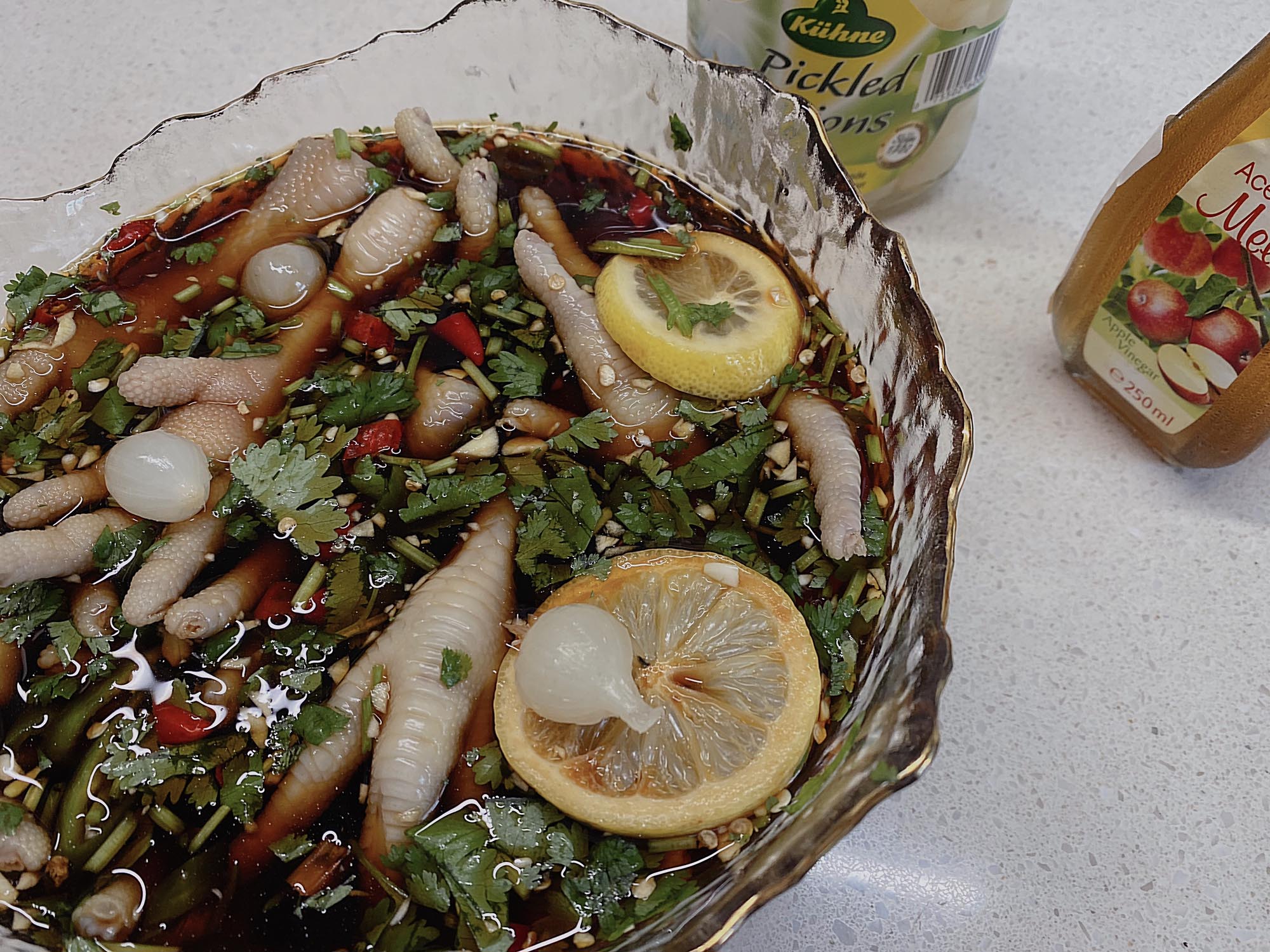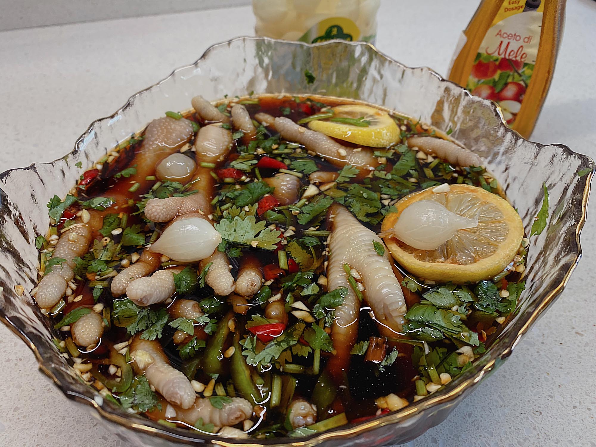 步骤7、鸡爪投入酱汁中,拌均匀,然后覆上保鲜膜,放冰箱冷藏腌制4小时以上,随吃随取!~