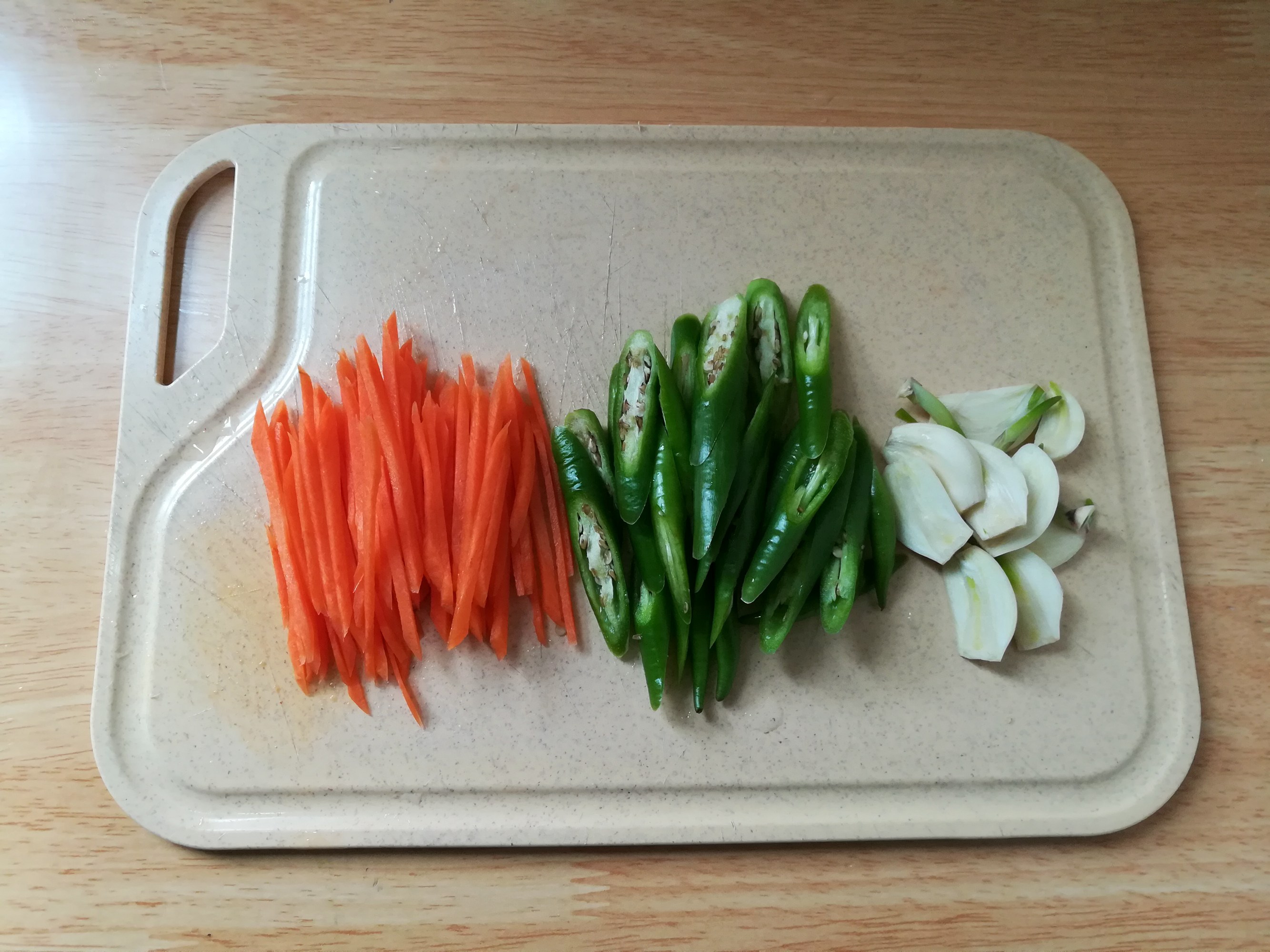 步骤3、蒜米切片,辣椒切段,胡萝卜切丝