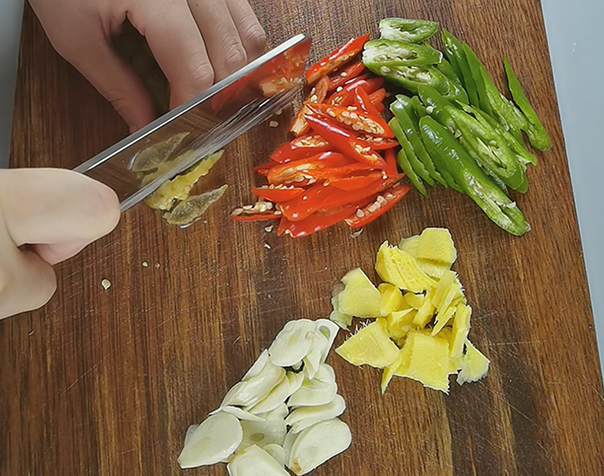 步骤2、准备青红椒,生姜大蒜和泡椒。