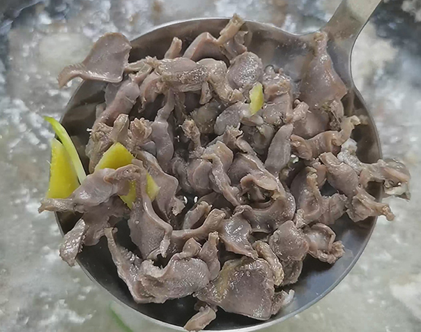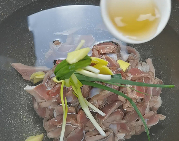 步骤4、鸡肫冷水下锅,放葱、姜和料酒去腥。
