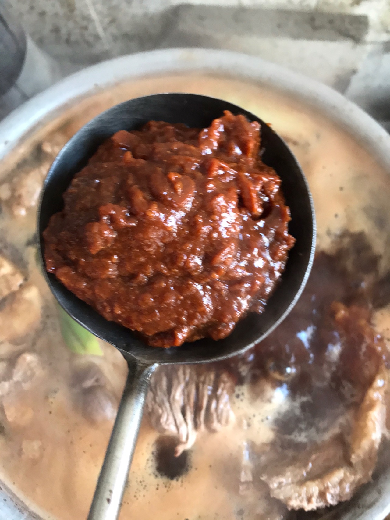 步骤4、浮沫撇干净之后加入生抽,老抽,豆瓣酱,卤肉料,大火煮开半小时转中火再煮三个小时即可,煮了两个小时后放盐,想要更加入味的话在汤汁中泡一夜更好