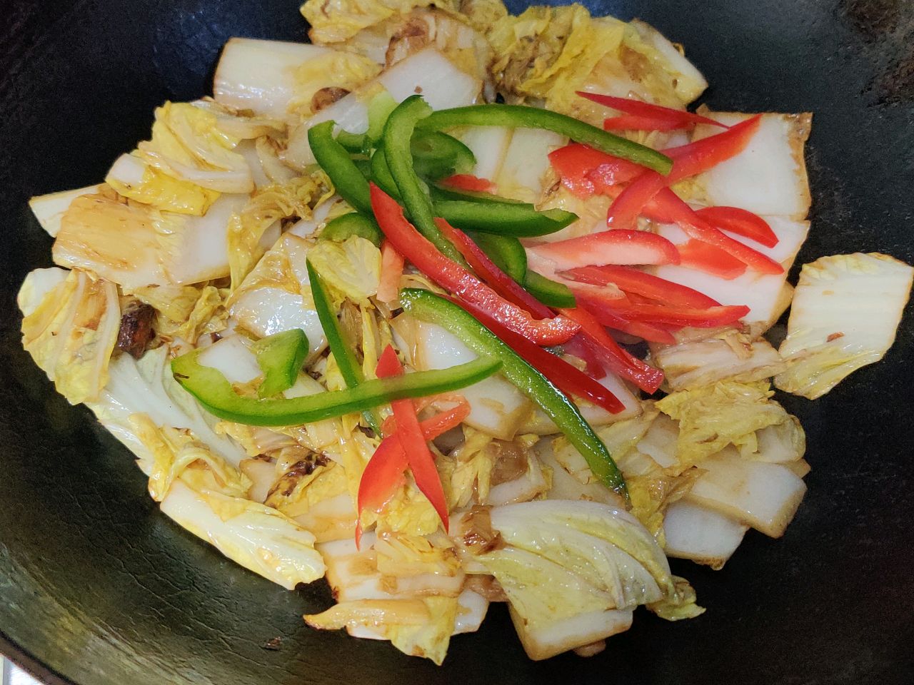 步骤1、大白菜洗净切块,菜叶菜帮分开;青红椒切丝(主要是为了色彩搭配);葱花若干;大蒜切片;生姜切丝