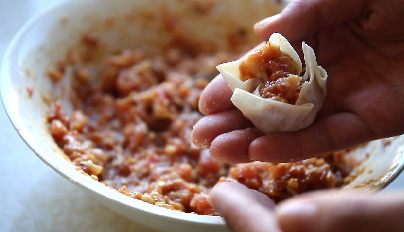 步骤5、取一张云吞皮,放一团肉馅在正中间,一边在手心转动,一边将皮捏上。切记不要封口!