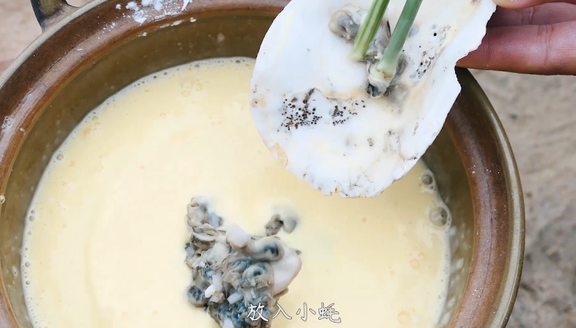 步骤4、在生粉中打入4个鸡蛋,搅匀成蛋液,将野生小蚝肉放入,搅拌均匀。