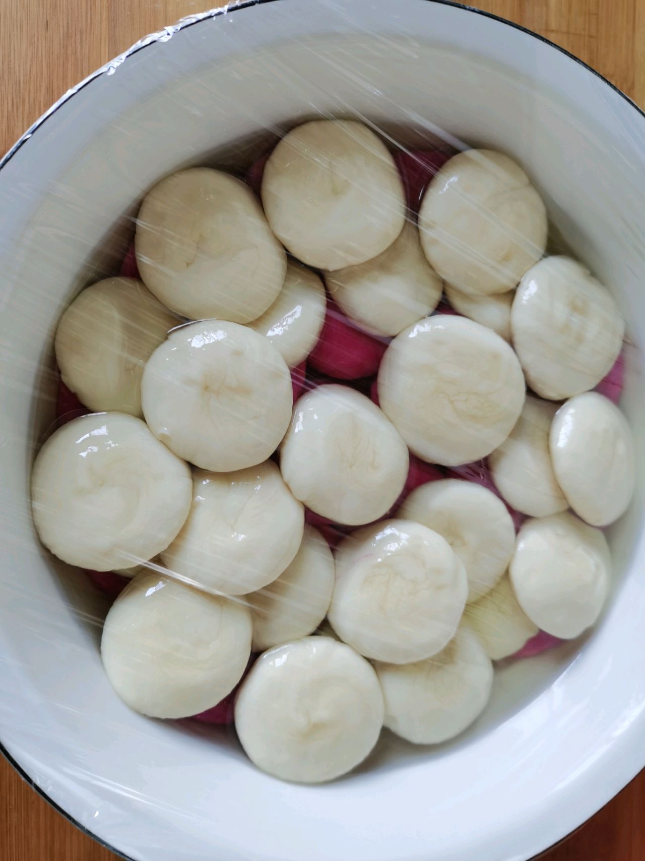 步骤3、分别把白色和粉色小面剂揉圆压扁,放入容器中,倒入食用油,盖保鲜膜醒发,两小时以上