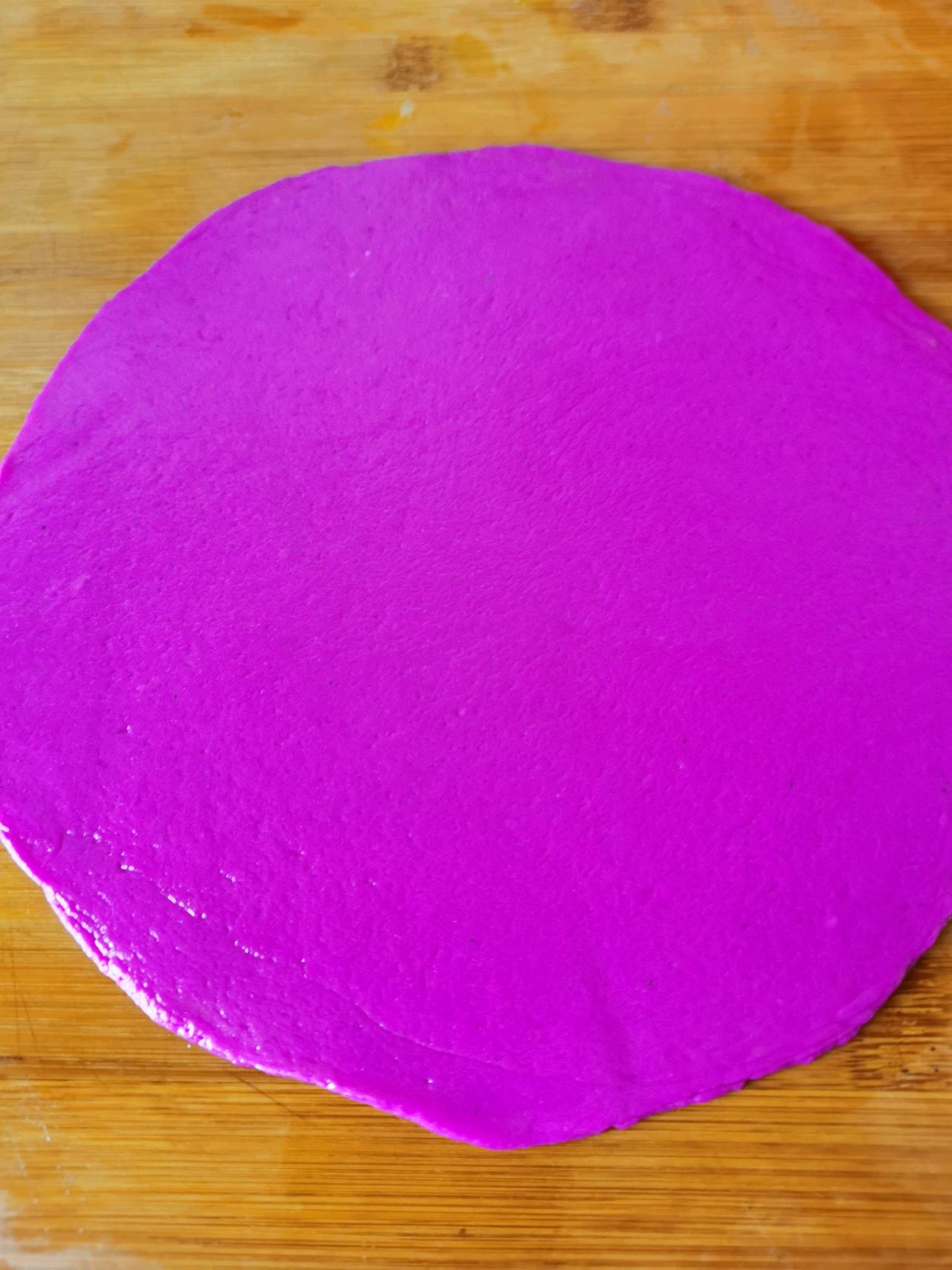 步骤4、取相同颜色的面积3到5个,摞在一起,压出中间多余的油,在面板上擀成薄饼。擀饼时用力一定要均匀。