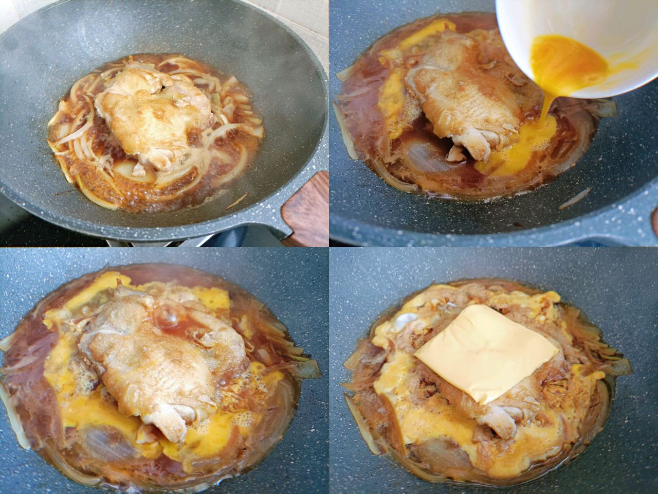 步骤6、下入煎好的鸡腿盖上盖子焖煮10~15分钟,然后加入打散的鸡蛋,盖上盖子焖煮2~3分钟,打开盖子后加上一片芝士片,然后直接关火,盖上盖子利用余温再焖2~3分钟。